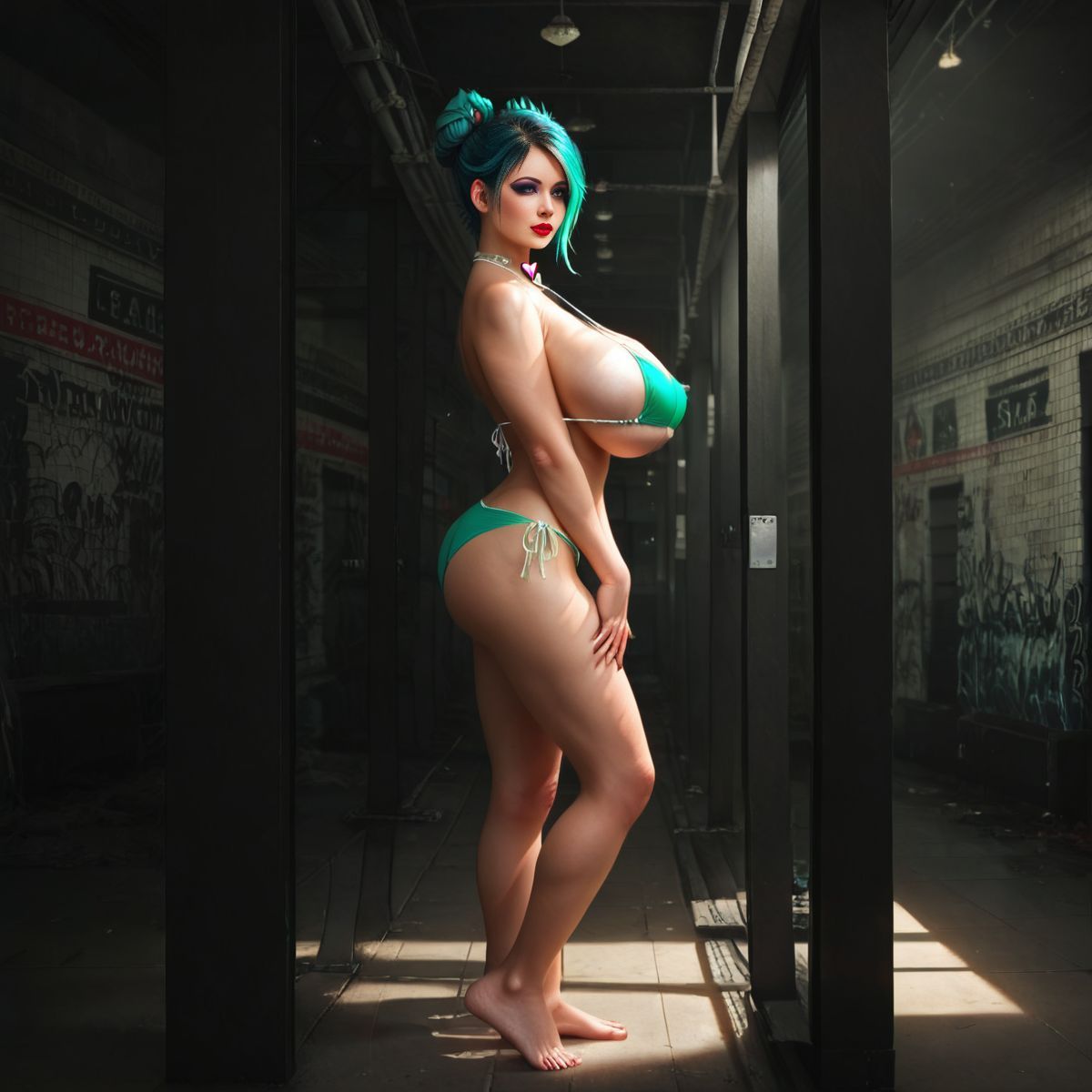 She roamed, her blue hair catching the light, her confidence radiating through the station. The pillars stood like silent sentinels, their weathered surfaces reflecting the dim glow as she passed, each step bringing her closer to the heart of the place.