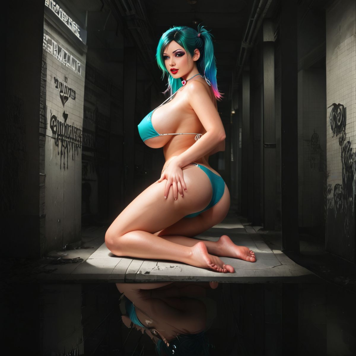 She moved through this desolate place with an ease that suggested she belonged nowhere and everywhere at once. Her blue hair cascaded around her shoulders, a vibrant contrast to the muted tones of the abandoned station.