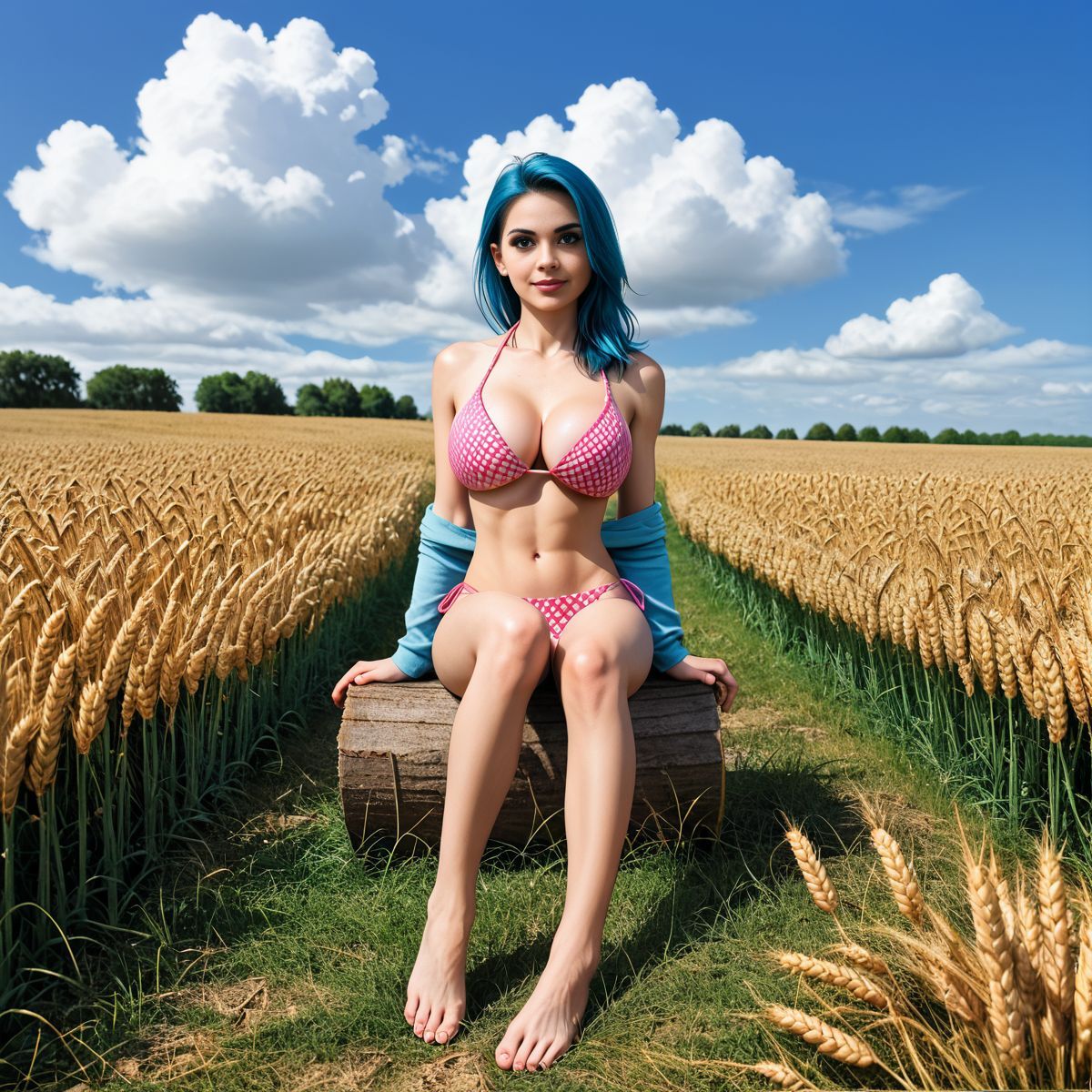 Mid-late September, and I’m owning this Kansas wheat field, the sun drenching my skin with heat that makes me feel like a spark ready to ignite. The golden stalks graze my legs, their touch soft and needy, while a cool breeze plays with my electric blue hair, letting it whip wild. My two-piece bikini’s tight as hell, stretchy fabric clinging to every curve, its thin straps knotted at my hips and back, carving my body into a shape that’s pure temptation. I’m a tease on fire, and this field’s about to feel my heat.
