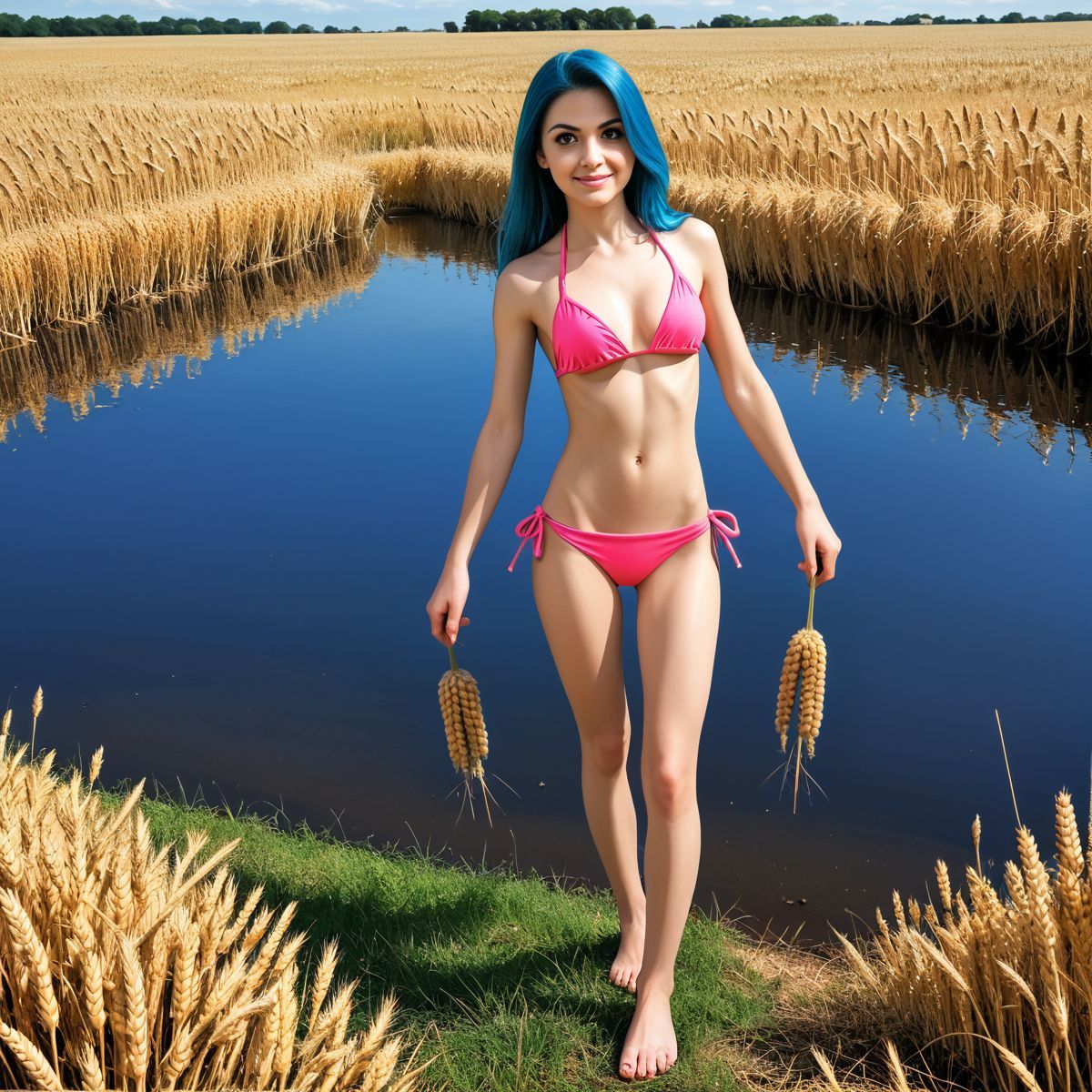 Mid-late September, and I’m owning this Kansas wheat field, the sun drenching my skin with heat that makes me feel like a spark ready to ignite. The golden stalks graze my legs, their touch soft and needy, while a cool breeze plays with my electric blue hair, letting it whip wild. My two-piece bikini’s tight as hell, stretchy fabric clinging to every curve, its thin straps knotted at my hips and back, carving my body into a shape that’s pure temptation. I’m a tease on fire, and this field’s about to feel my heat.