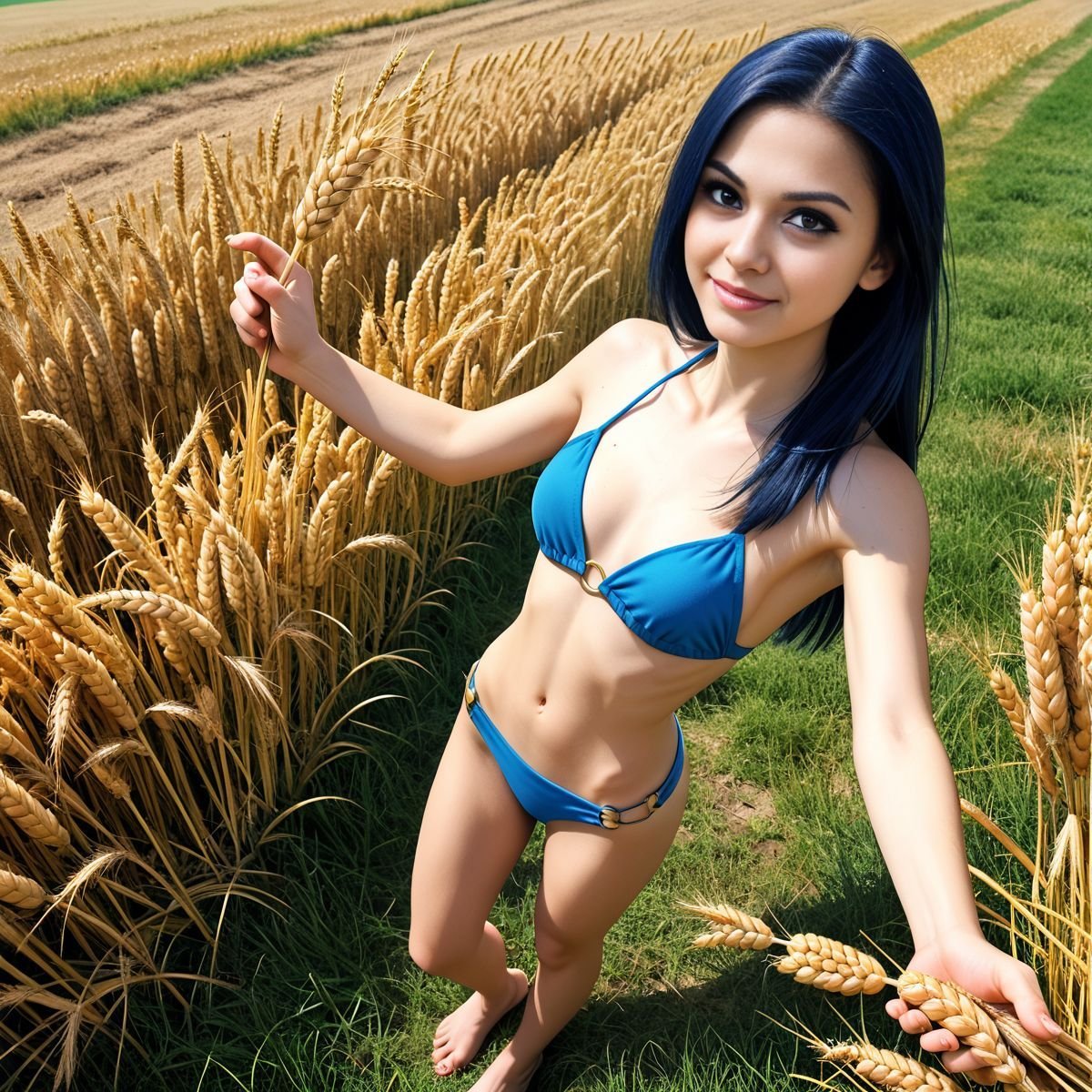 Mid-late September, and I’m owning this Kansas wheat field, the sun drenching my skin with heat that makes me feel like a spark ready to ignite. The golden stalks graze my legs, their touch soft and needy, while a cool breeze plays with my electric blue hair, letting it whip wild. My two-piece bikini’s tight as hell, stretchy fabric clinging to every curve, its thin straps knotted at my hips and back, carving my body into a shape that’s pure temptation. I’m a tease on fire, and this field’s about to feel my heat.