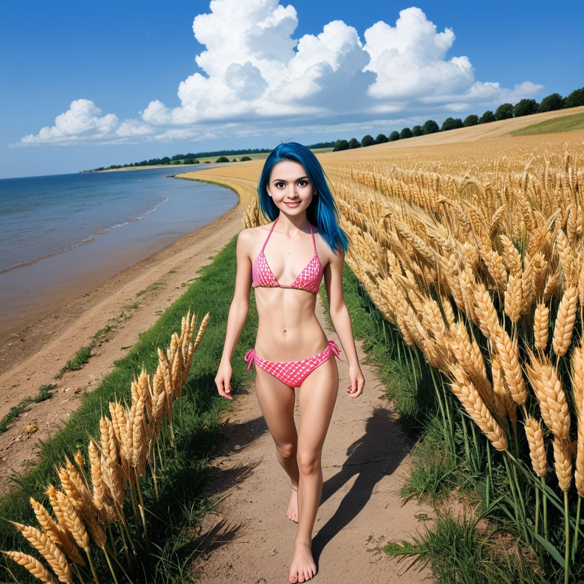 Mid-late September, and I’m owning this Kansas wheat field, the sun drenching my skin with heat that makes me feel like a spark ready to ignite. The golden stalks graze my legs, their touch soft and needy, while a cool breeze plays with my electric blue hair, letting it whip wild. My two-piece bikini’s tight as hell, stretchy fabric clinging to every curve, its thin straps knotted at my hips and back, carving my body into a shape that’s pure temptation. I’m a tease on fire, and this field’s about to feel my heat.